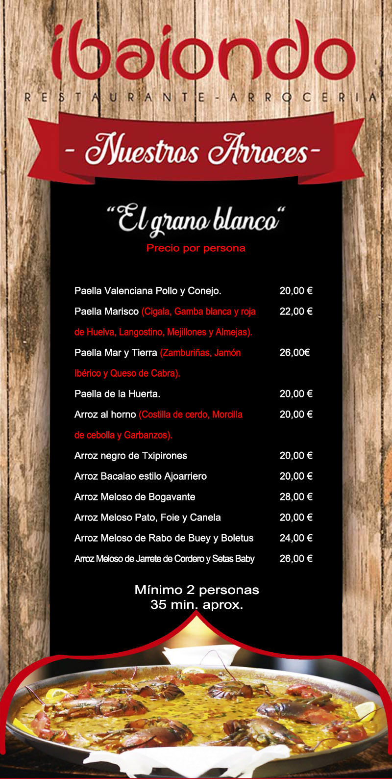 Elaboramos paellas -bajo pedido- con una antelación de 24 horas a la de su preparación, para que pase a recogerla el cliente por Ibaiondo. El pago de la misma se hace al realizar el pedido.